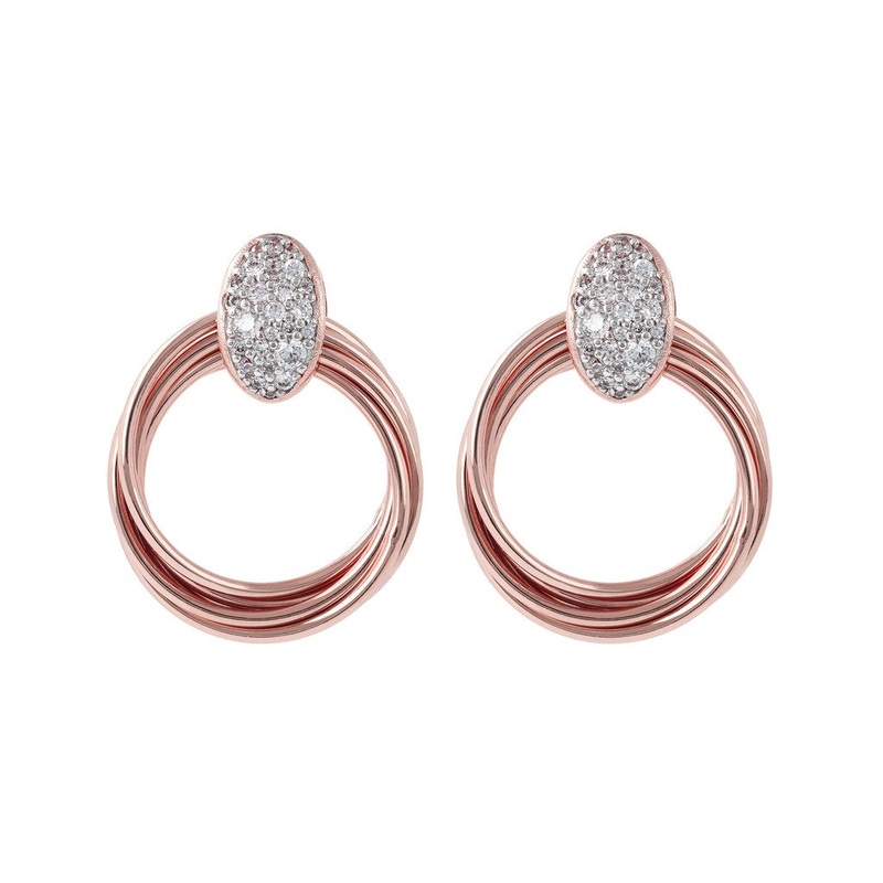 Modern classics that surpass the fades and seasons. These timeless yet remarkable Multicircle Dangle Earrings with CZ are a new must-have, featuring authentic Italian design and craftsmanship at its best. A bold curvaceous set of intertwined rings in Golden Rose, the 18KT rose gold plated patented blend to form a Geometric rigorous design make a typical image of love and authentic affection. The multiple circles are reunited by the means of a gleaming element, all encrusted with a delicate shiny pave of white Cubic Zirconia. Dare the affordable luxury alternative, and speak the language of feelings with this iconic, bold design that is the ideal carryover and a perfect gift for your beloved one. Matching necklace available. – Code: WSBZ00861
