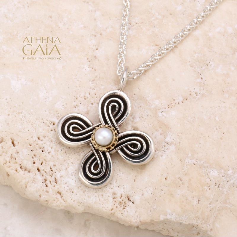 The Monastiraki Infinity Greek Cross is crafted from sterling silver and features a stone set in 18k gold. The cross brings forth the enigma of ancient history found in the little church of Monastiraki and is perfect for baptisms or as a daily reminder of your beliefs.