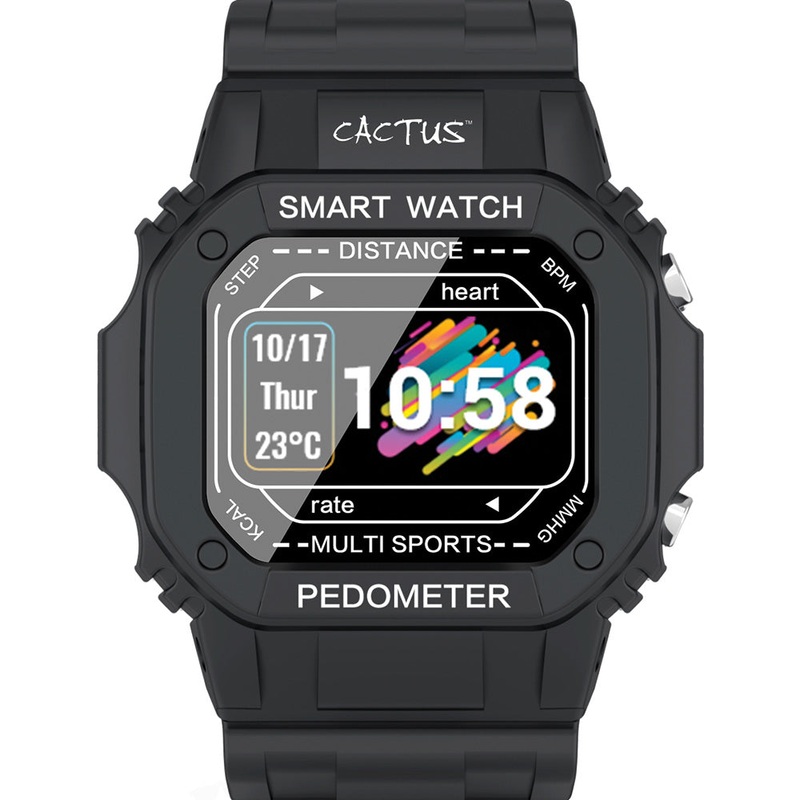 Introducing the Cactus Nexus Smartwatch & Fitness Trackera versatile device that combines smartwatch features with fitness tracking capabilities. With three sport modes, heart rate monitoring, step counting, and push notification alerts, the Nexus keeps you connected and on track with your fitness goals. Connects with Bluetooth to smartphones running Android 4.4 & above / iOS 8.0 & above using the Adorhealth App. Its durable design includes a TPU band with buckle and a plastic case, with IP67 water resistance.*Measurement results of this product are for reference only not for any medical use* – Heart Rate Monitor – Step Counter – Distance – Calories – Sleep – Time – Alarm – Calls & SMS Alert – Sedentary Alert – Screen Size .96 – Multiple Screen Display Options – Multi Sport Modes – Find my Phone – Message Storage – Blood Pressure – Blood Oxygen – Weather – Stopwatch – Remote Camera Shot – One Year Warranty – Connects with Bluetooth to smartphones with Android 4.4 & above / iOS 8.0 & above – Adorhealth App – Strap Material – TPU Band with Buckle – Case material – plastic – IP67 water resistant (Do not swim with this product) – Battery capacity: 200 mAh