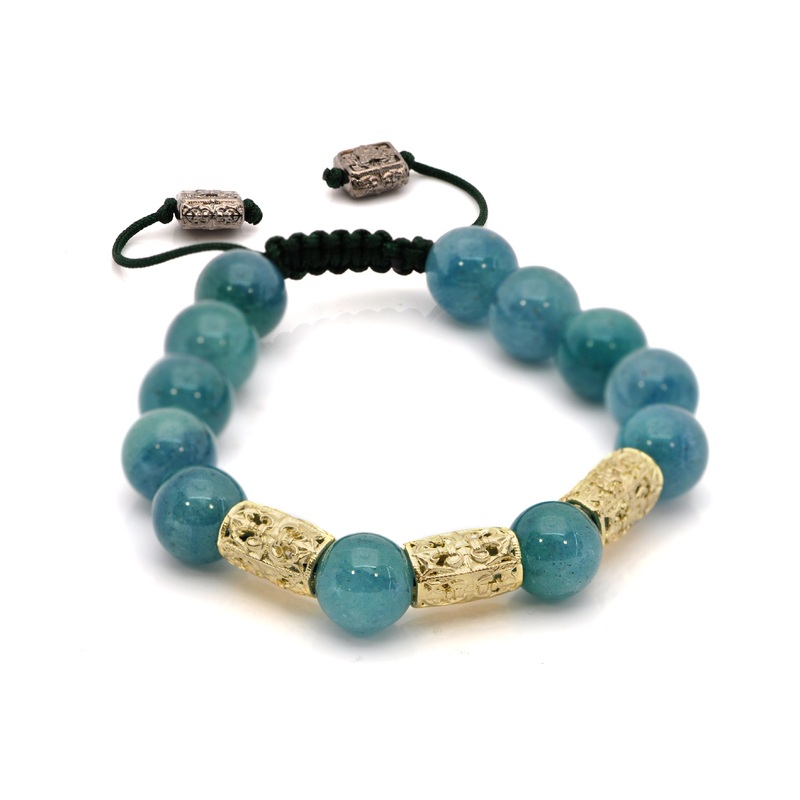18k Yellow Gold and Blackened rhodium finish Sterling Silver beaded adjustable pull bracelet with 10mm Aventurine beads and carved stations with silver pull boxes. Measures 10mm wide.