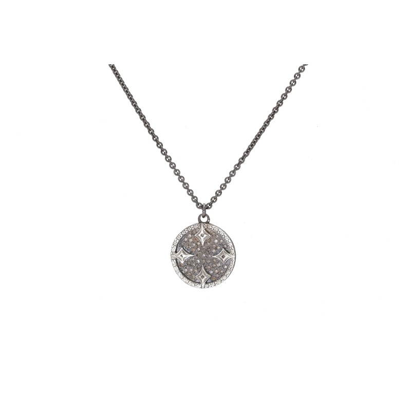 Sterling Silver Small Circle Pave Disc Pendant Necklace with Crivelli Corners and Pave Champagne Diamonds. Adjustable at 16″-18″.
