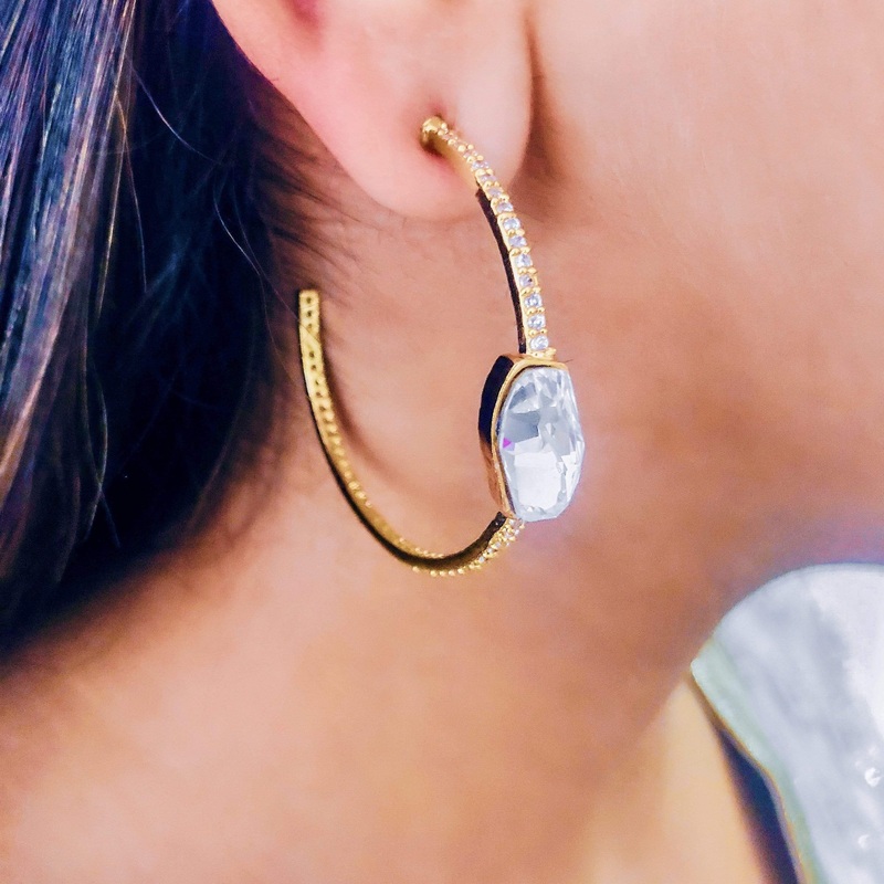 The Celeste Earrings are from our Windfall Collection.Easy to style on all kinds of different looks, the Celeste Earrings will add just the needed amount of glamour and shine to your outfits. Sculpted in the evergreen hoop design, the earrings are studded