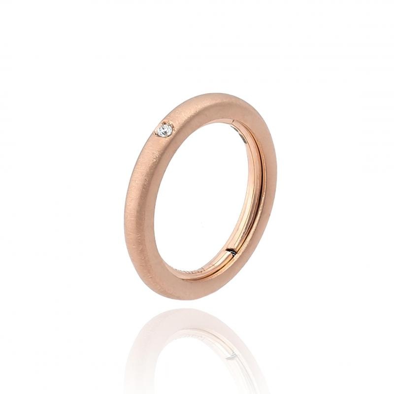 18 kt rose satin gold ring with solitaire natural diamond ct. 0,02. Band height 2,5 mm. The ring hosts the patented Size-Fit system that adapts to the fingers.