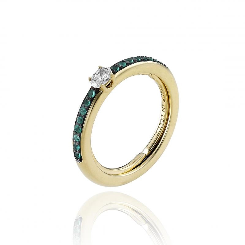 18 kt yellow gold band ring with emeralds (0,128 ct) and oval cut white diamond (0,14 ct). Band width 2,5 mm.