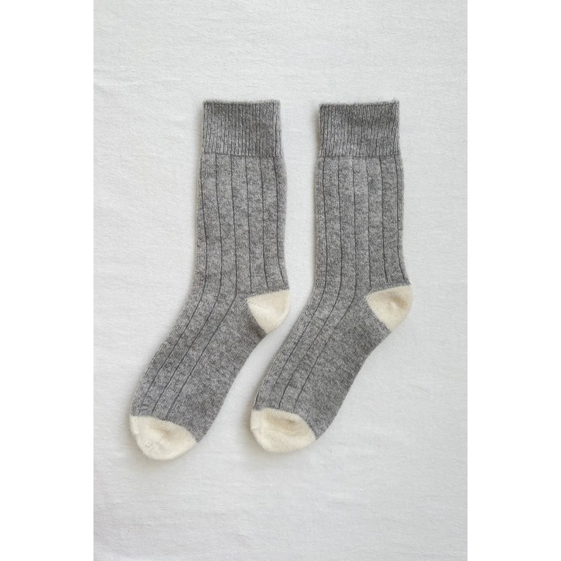 Vintage-esque Cashmere blended socks with a wide ribbing detail and tonal contrasting heel and toe. This elegant and classic sock will be your go to during the colder season.