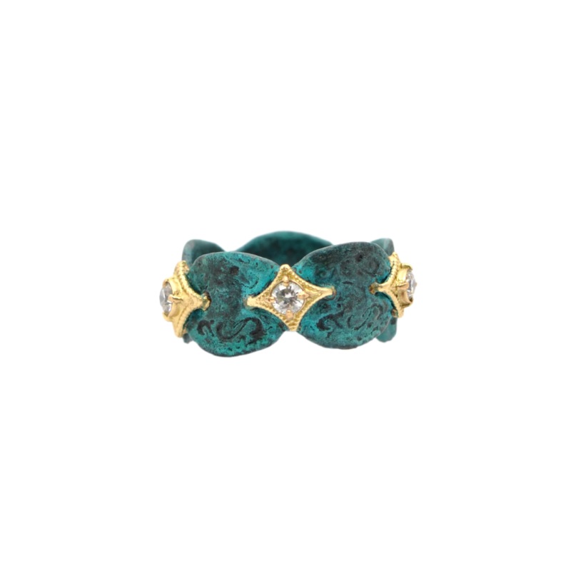 18k Yellow Gold artifact coin ring in teal patina with crivellis and 0.47TCW white diamonds. Band measures 9.5mm wide.