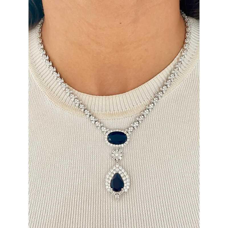 Capture timeless elegance with the Comet Diamond Sapphire Tear Drop Necklace Set, featuring deep sapphire-blue stones paired with dazzling zircon crystals in a graceful tear-drop design inspired by celestial beauty. This exquisite necklace and matching earrings set is perfect for weddings, formal occasions, or gifting luxurious jewelry.