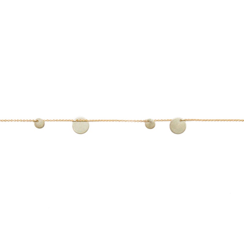 The confetti bracelet consists of seven sterling silver discs of varying size stationed around a 7″ 14k gold chain with a spring clasp. Handmade with a soft satin finish.