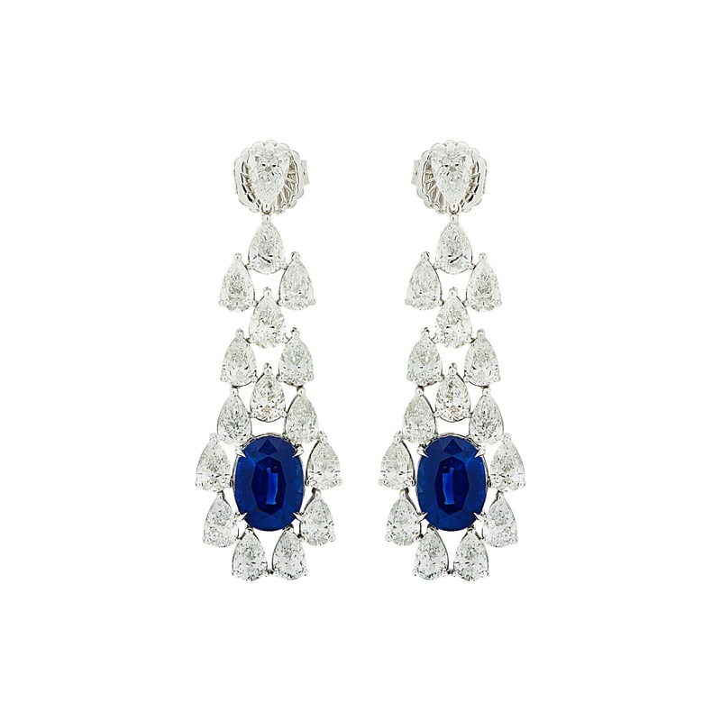 These earrings from Vivid Diamonds & Jewelry are crafted in 18kt white gold and feature GIA-certified Ceylon sapphires with a total weight of 10.93 carats, enhanced through heating for added appeal. Accompanying the sapphires are 32 pear-shaped diamonds, also GIA-certified, with a combined weight of 13.91 carats and color grades ranging from D to F. The design showcases modern symmetry and measures 2.10 inches in length while weighing just 17.40 grams for comfortable wear.