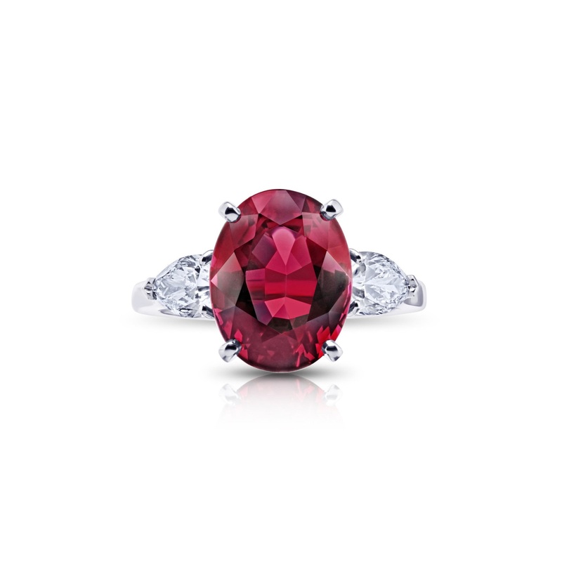 This unheated 6.05-carat oval red spinel and diamond ring is a newly manufactured piece. The ring features a stunning Tanzanian red spinel stone surrounded by approximately 0.93 carats of diamonds, all set in a handmade platinum and 18kt yellow gold band. Crafted by David Gross Group, this size 7 ring is not resizable and comes with a C. Dunaigre report verifying the spinel’s quality and origin.