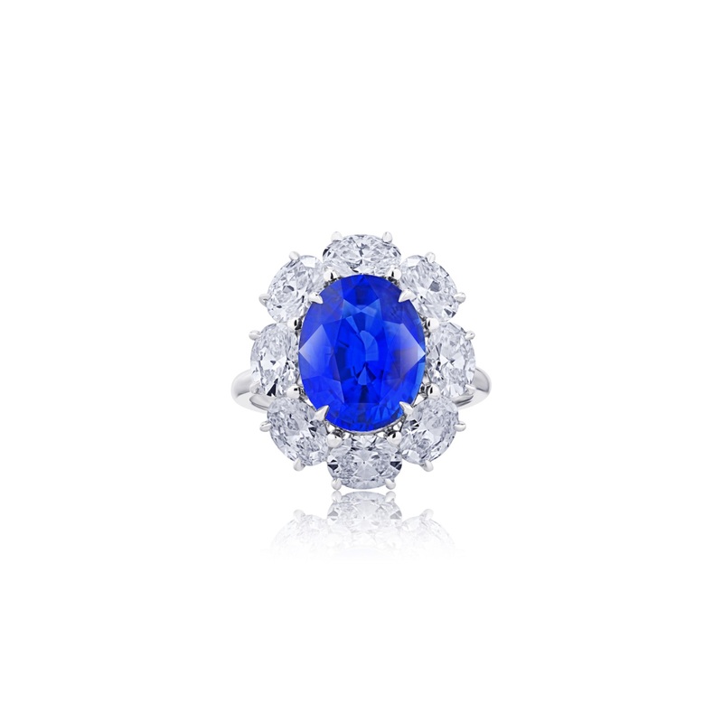 This is a newly designed ring by David Gross Group. It features a 4.18-carat oval blue sapphire surrounded by eight brilliant diamonds totaling about 2.68 carats, all set in a handmade platinum band. Please note that this size 7 (US) ring cannot be resized and is accompanied by a GIA report.