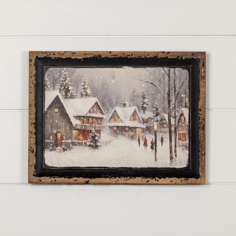 Just like our beautiful and cozy little Chepachet Village, this print portrays a quaint little town blanketed in snow. Warm light emanates from the windows while shoppers go about their day – Candlelight Shopping at its best! Print is contained within a rustic, vintage black and gold accented frame.