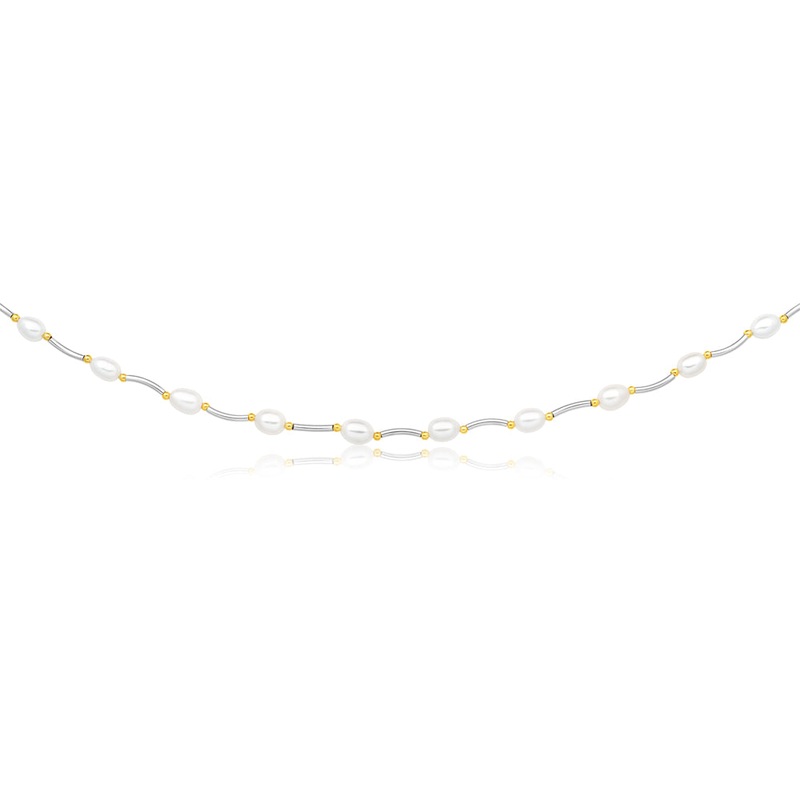 For a unique statement piece, you cant miss this beautiful Cream Freshwater Pearl Oval Bar & Ball Necklace. The necklace features freshwater pearls that have swirls of pink and white you will adore. Beaded between small gold balls and bars, this is a uniqu