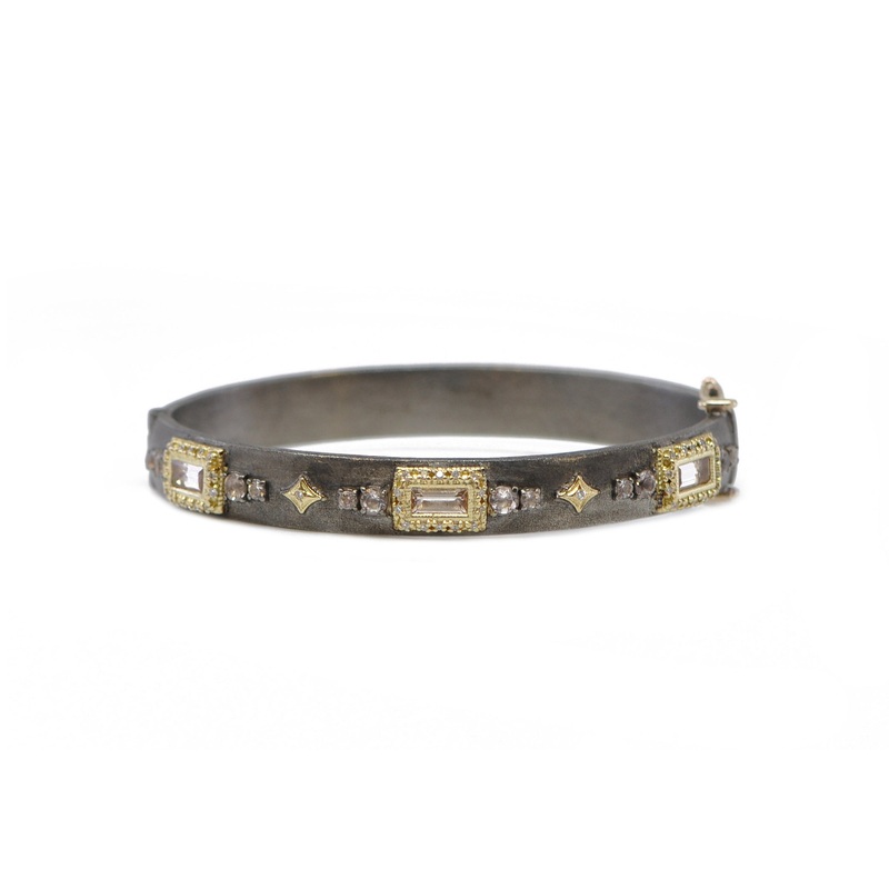 18k Yellow Gold and Grey Sterling SilverCrivelli Huggie Braceletwith 0.03 CT White Diamonds and 6x3mm Morganite.