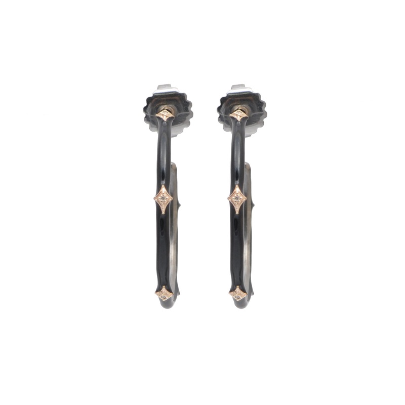 Contemporary and geometric the Black Enamel Crivelli Hoop earrings are perfect for everyday wear. Sleek and elegant black enamel adorned with several 14kt rose gold modern Crivelli elements and set with round champagne diamonds for a little shine to elevate your everyday luxe style.