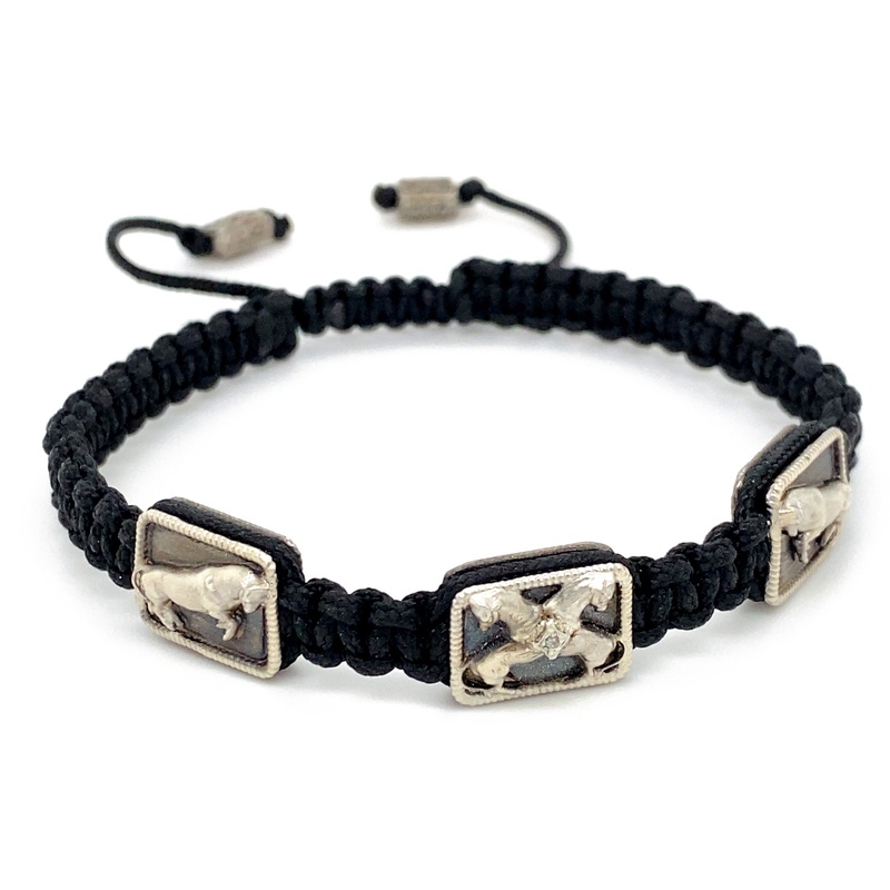 18k Yellow Gold and Blackened Sterling Silver Woven Pull Bracelet with 3 Bull Stations and Champagne Diamond Crivelli. (.06 TCW).
