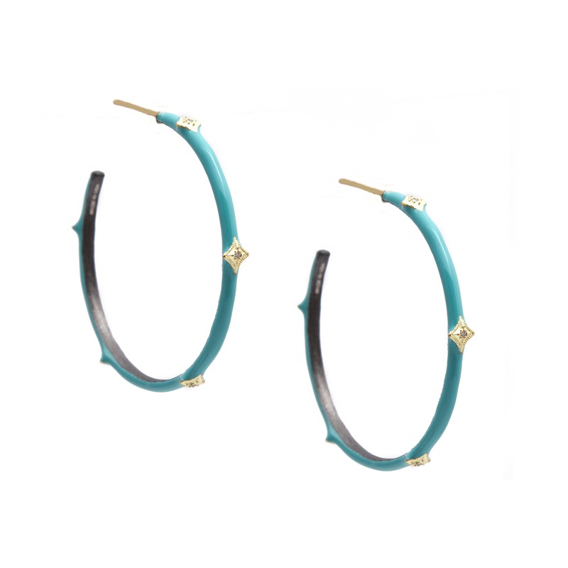 14K Rose Gold and Grey Sterling Silver 52MM Crivelli Hoop Earrings in Black Enamel with Champagne Diamonds. (0.06 TCW)