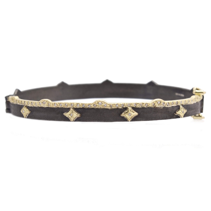 Medieval royalty meets modern-day design and style. Crafted with over 50 white brilliant diamonds, this narrow-hinged bangle is defined by its yellow gold textural pointed details that adorn the edge of the blackened silver bracelet like an ancient medieval diadem crown. Elegant design that is enchanting and radiates strength.