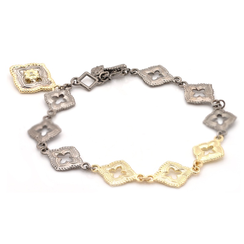 18k Yellow Gold and Grey rhodium finish Sterling Silver open scroll bracelet with crivelli scroll charm with 0.01TCW round champagne diamond accent. Toggle closure. Adjustable at 7" and 7.5". Bracelet measures 10.7mm wide. Charm drop measures 20.6mmx15mm.