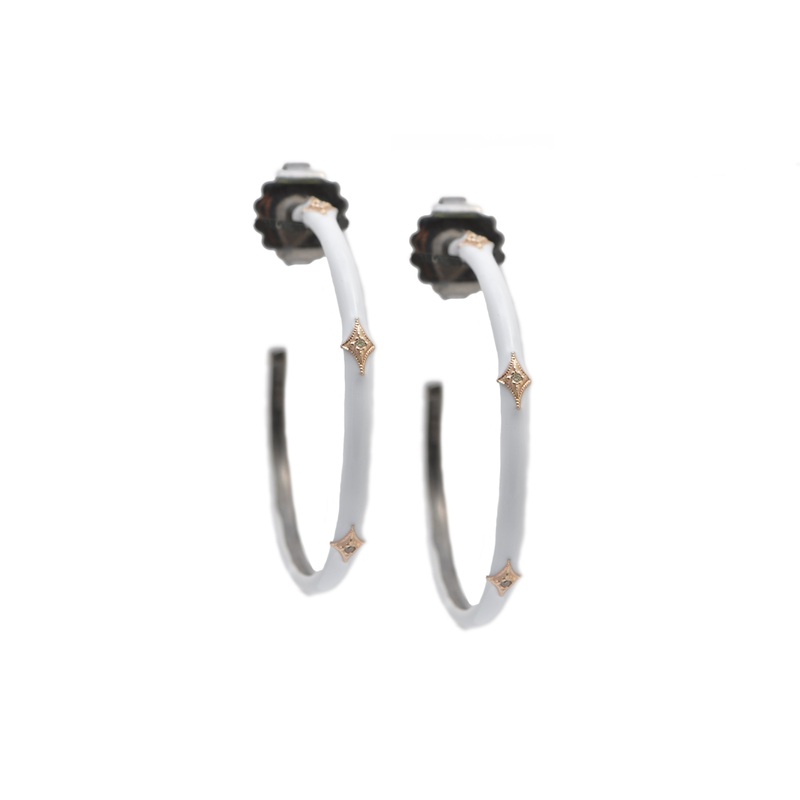 Contemporary and geometric the White Enamel Crivelli Hoop earrings are perfect for everyday wear. Sleek and elegant white enamel adorned with several 14kt rose gold modern Crivelli elements and set with round champagne diamonds for a little shine to elevate your everyday luxe style.