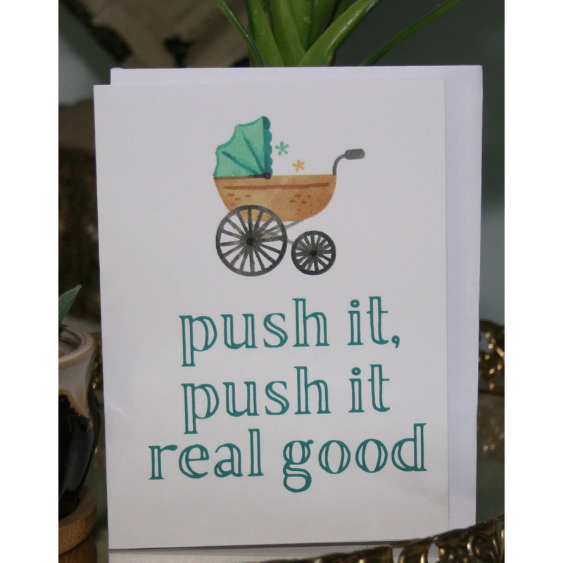 Push it! Push it!Greeting Card measures 4.25″x 5.5″Blank insideGreeting cards come packaged in a resealable cellophane bag with a white envelope