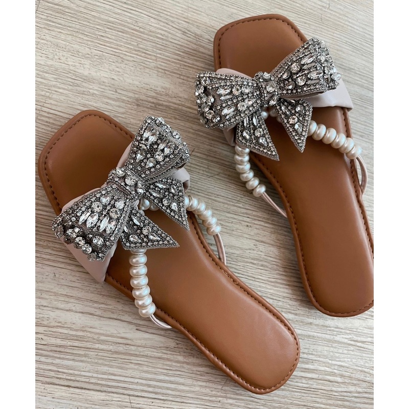 The Crystal Bow Pearly Line Sliders made from Rexin embellished with Swarovski Crystals & Semi Precious Pearls. (Same Initial on Each Shoe) is the perfect Slider to wear to all Occasions.
