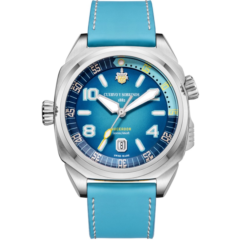 Cuervo y Sobrinos Watch Buceador Caribe Divers Varadero Beach 2860.1AZ. The Cuervo y Sobrinos watchesBuceador Caribe, a divers watch inspired by cyan coloured seas, pastel sands and Cubas aquatic world. It has a highly complex case featuring a container type construction that contributes to the models impressive water resistance of 200m. This contemporary watch, brimming with Caribbean charm, is both practical and stylish.