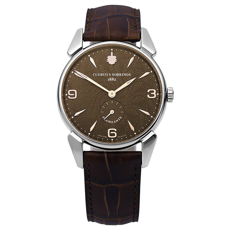 A reproduction of an iconic and original Cuervo y Sobrinos model produced from the 1940s, the Historiador collection is distinctive and elegant, a statement watch for a man of style, with a strong personality, and natural grace. This Historiador Flameante features a 40 mm stainless steel case with a polished fixed bezel that holds a brown guilloche “flameante” dial under a double curved sapphire crystal. It has rose gold-tone and luminescent leaf hands and indices, Arabic numerals, and the brand’s crest at the 12 o’clock position as hour markers. Complementing this vintage-style dress watch are teardrop lugs, a signed crown, and recessed sub-seconds at the 6 o’clock position. It is fitted with a brown leather strap and secured by a stainless steel signed buckle. The exhibition case back highlights the caliber CYS 2052, a Swiss manual winding movement beating at 28,800 vibrations per hour, generating 42 hours of power reserve, and is water-resistant up to 50 meters/165 feet.