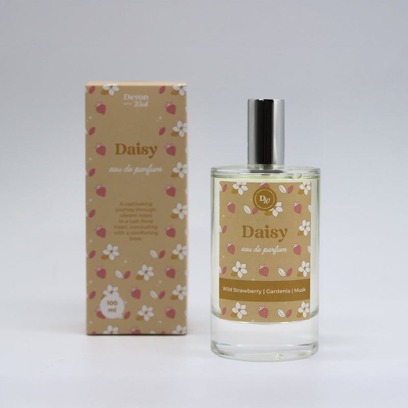 Daisy unfolds with the natural freshness of wild strawberry, transitions into a velvety heart of gardenia, and finishes with the warm sensuality of musk, vanilla infusion, and white sandalwood. The fragrance reveals a captivating journey through vibrant top notes to a lush floral heart, concluding with a comforting and alluring base.