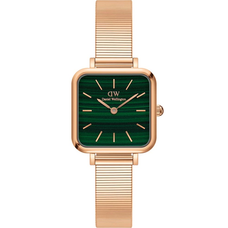 Indulge in contemporary elegance with the Daniel Wellington DW00100520 Quatro Studio Green Dial Watch. Crafted in captivating rose gold tones that exude a warm and feminine allure, this timepiece is both stylish and sophisticated. The dial features a subtle yet striking striped texture in vivid shades of green. The stainless-steel bracelet is smooth and moulds comfortably to the wrist, ensuring a pleasant wearing experience.The Quadro Studio showcases a petite and glossy emerald green dial, perfectly complemented by the sleek Piano strap. Crafted from polished stainless steel and available in refined rose gold plating, it combines retro charm with enduring appeal.- Japanese Quartz Movement- 22x22mm Case Size- Stainless Steel Case and Mesh Strap- 10mm Strap Width – Piano Link- 30 Meters Water Resistant