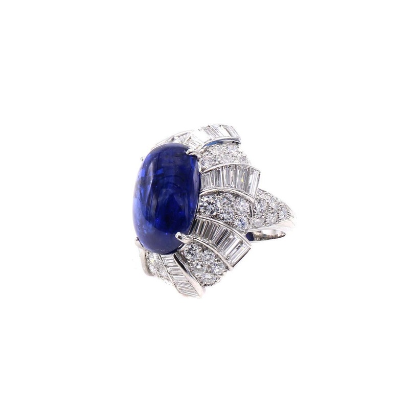 This 1950s platinum ring, designed by renowned American jeweler David Webb, features a stunningly saturated cabochon sapphire weighing 17.02 carats. The natural sapphire is of Burmese origin and has not been heat treated. It’s surrounded by seven channels of bright white baguette-cut diamonds separated by pave-set round brilliant-cut diamonds with an estimated total weight of approximately 5.00 carats. The inside shank bears the signature “Webb” along with the weight of the sapphire inscribed as 17.02. This size 5.5 ring can be resized and comes in its original leather box from David Webb along with a letter of authenticity from David Webb and GIA and C. Dunaigre reports.