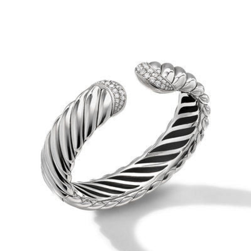 Ladies David Yurman bracelet. Sterling silver. 17mm Sculpted cable cuff bracelet with diamonds, diamond total weight of 1.38 carat.