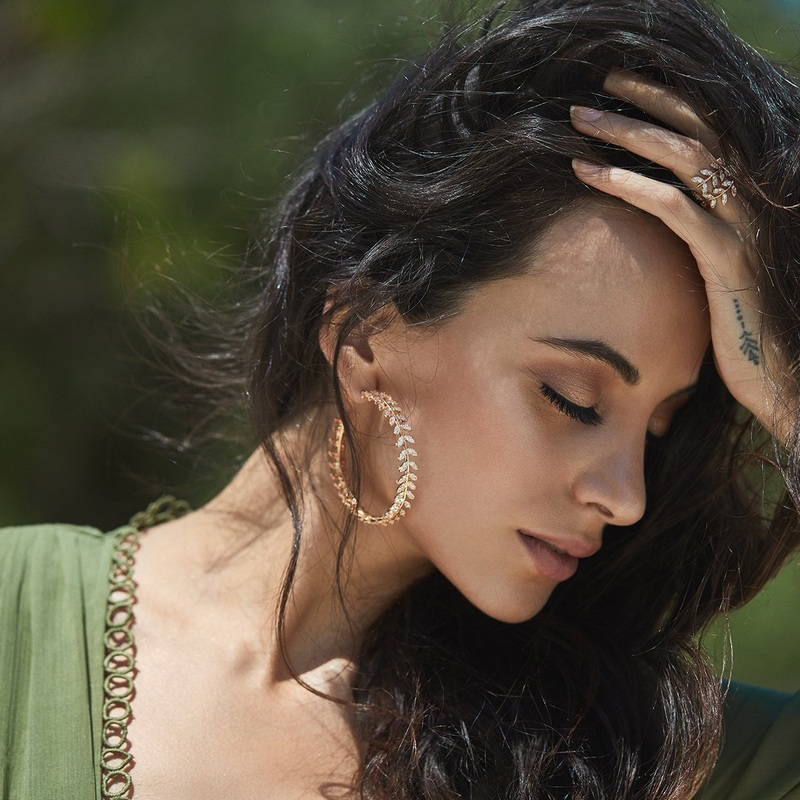 The Delia hoops are carefully curated leaf patterened hoops made of luminous sworovski crystals and polished with 24K rose gold finish.Style these literally on any outfit for some added glam.