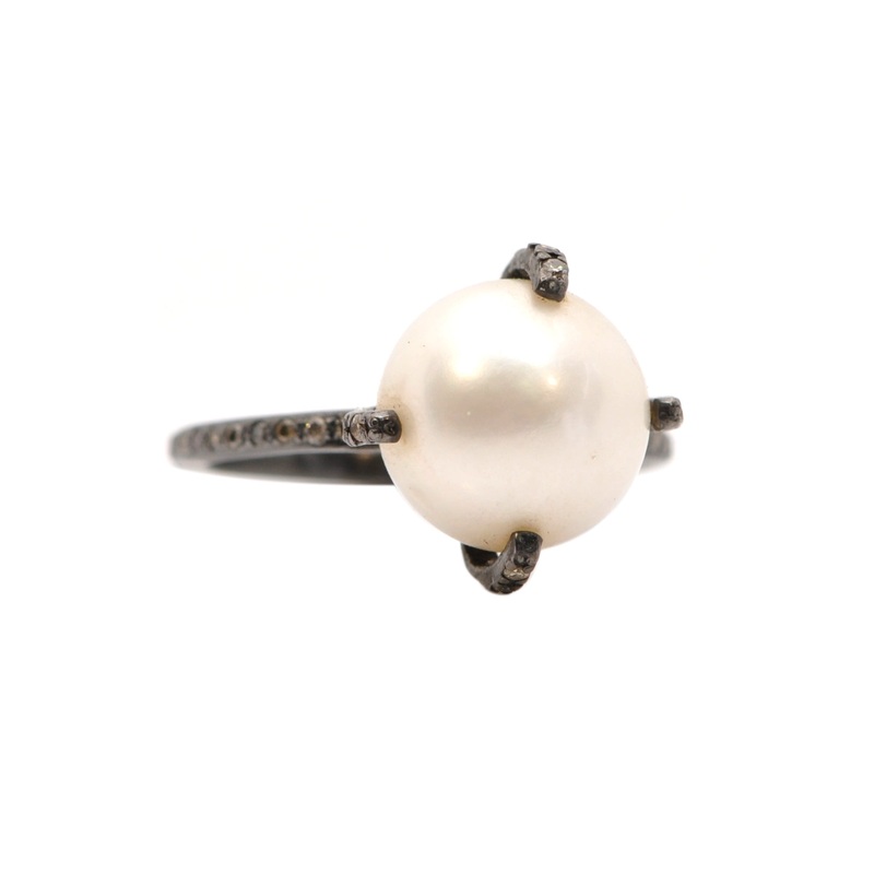 Blackened rhodium finish Sterling Silver pave diamond prong ring set with white button pearl on 0.25TCW round champagne diamond eternity band. Band measures 1.68mm.
