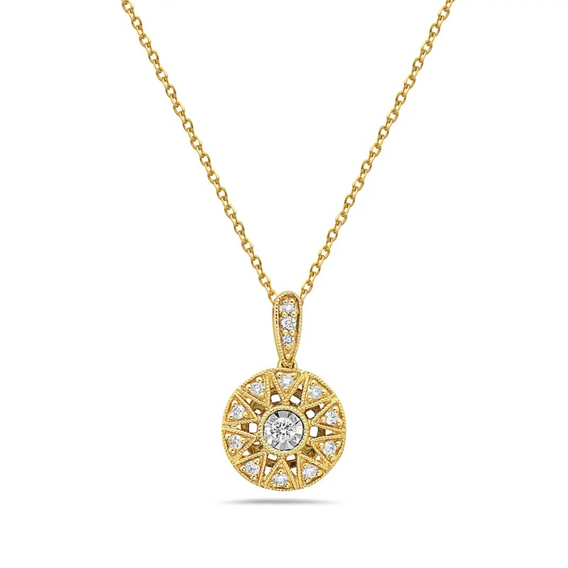 14 karat yellow gold cluster diamond pendant set with 14 round brilliant cut diamonds having a total weight of 0.12 carats clarity: SI1 color: G/H 14 karat yellow gold 18 cable link chain