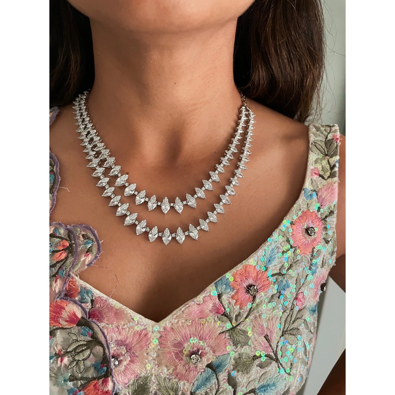 This Set includes Earrings & Necklace is made from Swarovski Diamonds to give you a gorgeous look. Make heads turn every time you adorn this Beautiful neckpiece. From sangeets to Reception, you cant miss out on this beauty..
