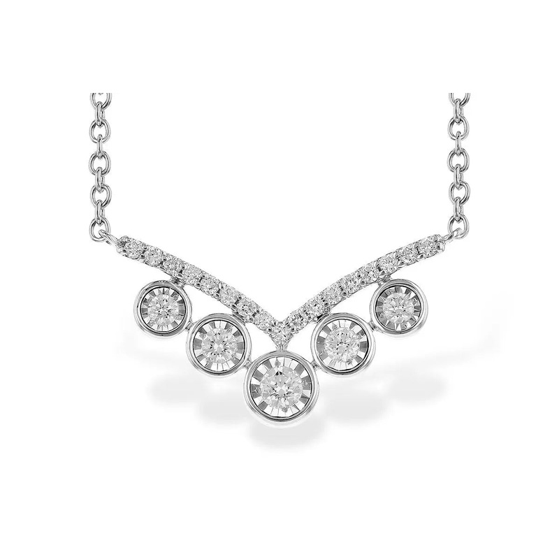 Crafted from exquisite 14 karat white gold, this V shaped diamond bar necklace showcases 22 round brilliant cut diamonds with a combined weight of 0.33 carats. The diamonds boast a clarity of SI3 and a color of G, adding to the luxurious allure. Suspended