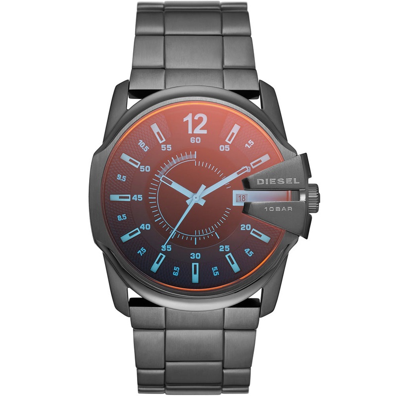 Presenting the Diesel DZ1965 Master Chief, a grey-tone stainless steel mens watch with a modern style. The has a stunning iridescent crystal that reflects a red and blue hue covering the dial. The dial has plenty of hour and minute indicators which is perfect for those who love a watch with a busy look. The watch also includes a date display to give you more information at the glance of your wrist.