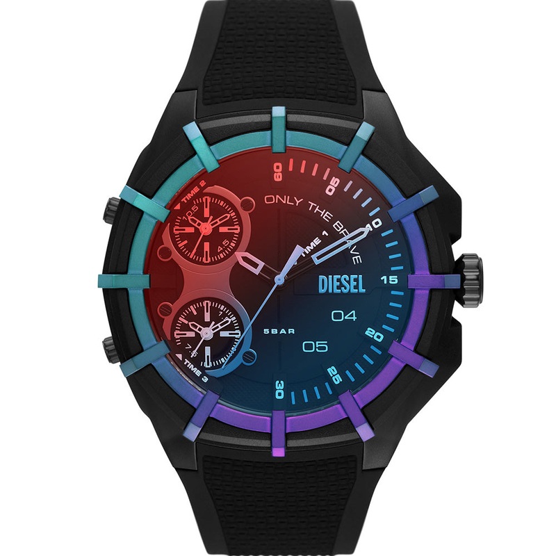 The Diesel DZ1986 Framed offers a striking blend of modern design and vibrant accents. Its 51mm black nylon case frames a sleek black dial highlighted with iridescent purple-blue accents that catch the light beautifully. The watch features precise quartz movement for reliable timekeeping and comes with a 24mm black silicone strap for both comfort and durability. With 50 meters of water resistance, its designed to be as functional as it is eye-catching.- Quartz Movement – 51mm Case Size – Nylon Case – Silicone Strap – 24mm Strap Width – 50 Meters Water Resistant
