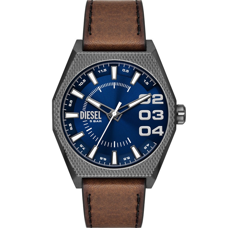 The Diesel DZ2189 Scraper boasts a rugged yet refined design with its gunmetal stainless-steel case and striking navy-blue dial. This timepiece features a robust quartz three-hand movement, ensuring precise timekeeping. The 43mm case size offers a bold presence on the wrist, complemented by a comfortable brown leather strap with a 22mm width. Protected by a durable mineral crystal, the watch is water-resistant up to 50 meters, making it both stylish and functional for everyday wear.- Quartz Three-Hand Movement – 43mm Case Size – Gunmetal Stainless-Steel Case – Leather Strap – 22mm Strap Width – Mineral Crystal – 50 Meters Water Resistant