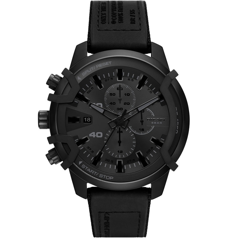 The Diesel DZ4556 Griffed Chronograph Mens Watch has a modern appeal, with an all-black look and keen level of detail. Performance matches style, with a chronograph stopwatch and 24-hour time showcased in three subdials. A silicone strap completes this tim