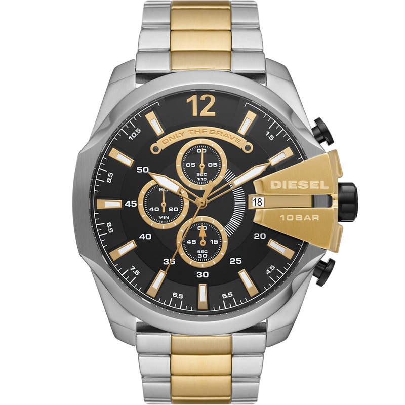 Introducing the Diesel DZ4581 Mega Chief, a modern mens watch with a two-tone gold and stainless steel finish. The bulky bracelet is perfect if you love wearing your watch with confidence. The dial is matte black with gold accents and has been set with three subdials and a date window for extra functionality. This watch is the perfect gents watch for those with active lifestyles and need a durable watch that is built to last.