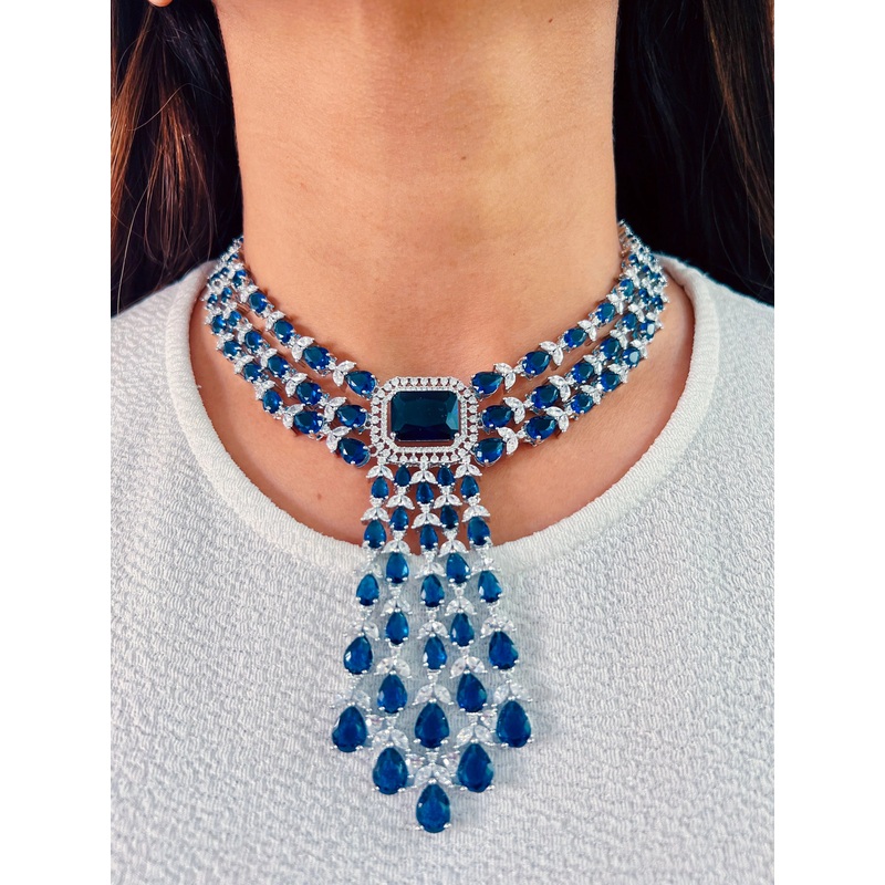 Indo western wear at its finest, the Swarovski diamond adorned Diza Set includes Earrings & Necklace, is here to give you that statement look, it imparts elegance and grace giving its wearer the best of both worlds. Be the star of any occasion with this one of a kind choker!