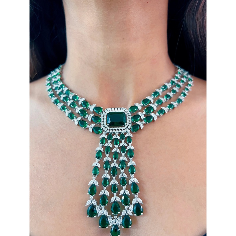 The Diza Emerald Set is all what you need!!Indo western wear at its finest, the Swarovski diamonds adorned Dizaincludes Earrings & Necklace, is here to give you that statement look, it imparts elegance and grace giving its wearer the best of both worlds. B