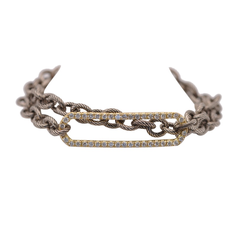 18k Yellow Gold and Grey rhodium finish Sterling Silver double wrap chain bracelet with diamond pave paperclip center piece set with 0.82TCW white diamonds. Toggle closure. Adjustable at 13″ and 13.5″. Measures 29.4mmx7.9 mm.
