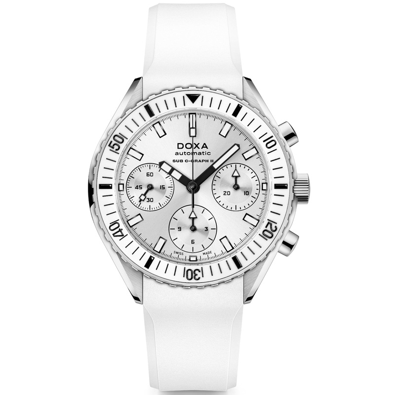 Doxa Watch Sub 200 C-Graph II Whitepearl Rubber 797.10.011W.23. The world of underwater caves and caverns! A unique scenery of out of this world rock formations, stalactites and stalagmites. Crystal clear waters that offer incredible visibility deep and far, an uncanny diversity of fish and other creatures. A fascinating and mysterious universe that is attracting more and more divers who are passionate about exploration. These divers, always with their trusted dive watch on the wrist, venture deep into the caves to discover natures hidden wonders.