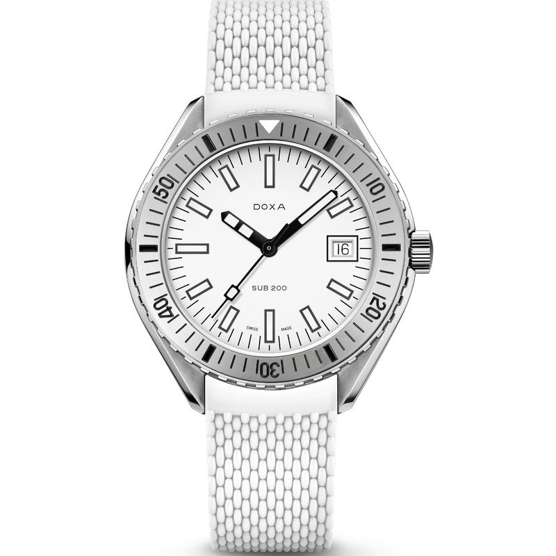 Doxa Sub 200 Whitepearl White Rubber Watch 796.10.011.23. A Refreshed SUB 200, featuring an elegant stainless steel inlay bezel. This recent update brings new life to the collection, with the addition of the stainless steel bezel enhancing the look of the SUB 200, whilst still maintaining the key characteristics that make the SUB 200 a success for DOXA.