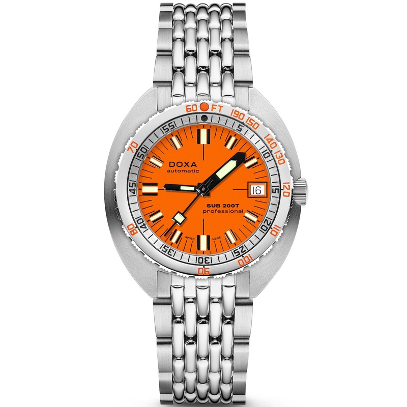 Doxa Watch SUB 200T Professional Iconic Bracelet 804.10.351.10. The Doxa watches SUB 200T skillfully retains all of the original SUBs DNA while embracing modern style and sophistication with its smaller diameter. In reworking the spatial volumes inside the case to bring it down to an elegant 39mm diameter and a more wearable thickness of 10.70 mm, DOXA has also tweaked the dial design to achieve a more contemporary visual presence on the wrist.