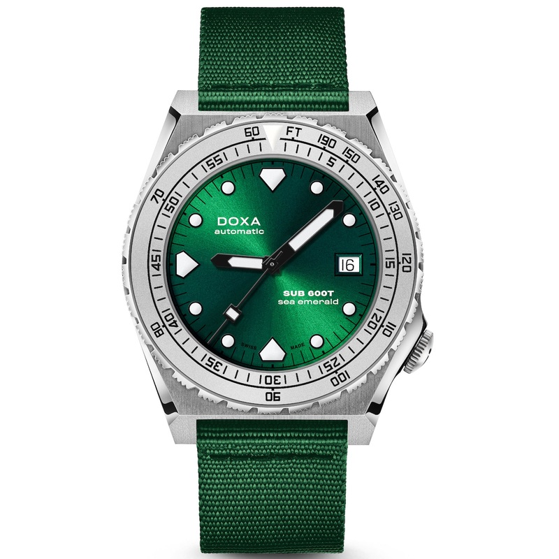 Doxa Watch SUB 600T Sea Emerald Nato 862.10.131.26-N. DOXA is doing more than just revisiting a chapter written long ago. They are paying tribute to the iconic SUB 600T with a new history that begins now. After the massive success of the limited titanium edition SUB 600T Pacific Blue this summer, DOXA is bringing out the SUB 600T in a non limited edition to complete the DOXA SUB line up. The reborn SUB 600T comes in stainless steel with the choice of a steel or black ceramic bezel insert, vibrant colors and either a stainless steel bracelet or a NATO strap to match the dial color.