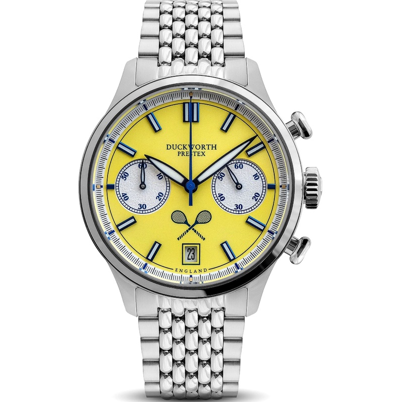 Duckworth Prestex Watch Lostock Yellow 40mm Quartz Chronograph Bracelet D547-09 ST. A 40mm diameter round case, quartz chronograph. It is the very first round watch and very first 40mm case size. It is named the LOSTOCK after the residential suburb of Bolton of the same name. Lostock which is the home of Bolton Golf Club and Bolton Ternnis Club. And where Neil Duckworth and generations of Duckworths have played these fabulous sports. A fitting name for a robust and stylish sports chronograph.